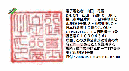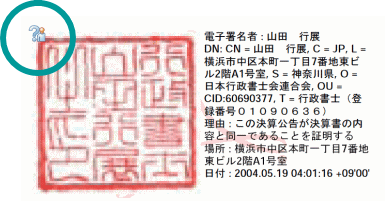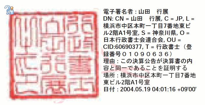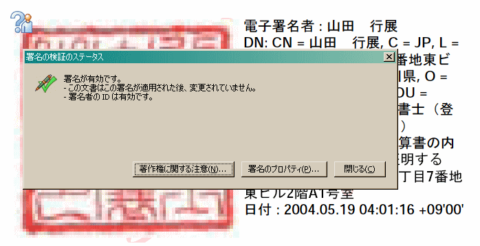 アクロバット・リーダー又はアクロバットの起動が終了すると次のように山田行展の職印(行政書士会に登録されている印章)が表示されます。しかし、この状態では左上の隅に「?」がまだついているはずです。
