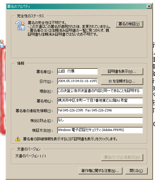 最初に、右の山田行展の「電子署名を確認する」をクリックしてください。するとアクロバット・リーダー又はアクロバットが起動します。