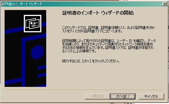 Bそして「証明書のインストール」を選択してください。その後次の画面が出ますので「次へ」をクリックしてください。
