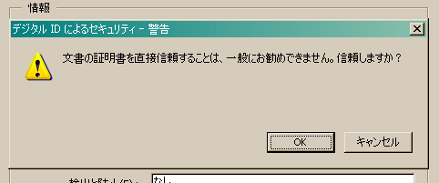 そして画面(署名のプロパティ)の中の「IDを信頼する」をクリックすると次の警告が出ますが、最初なので「OK」を選択してください。